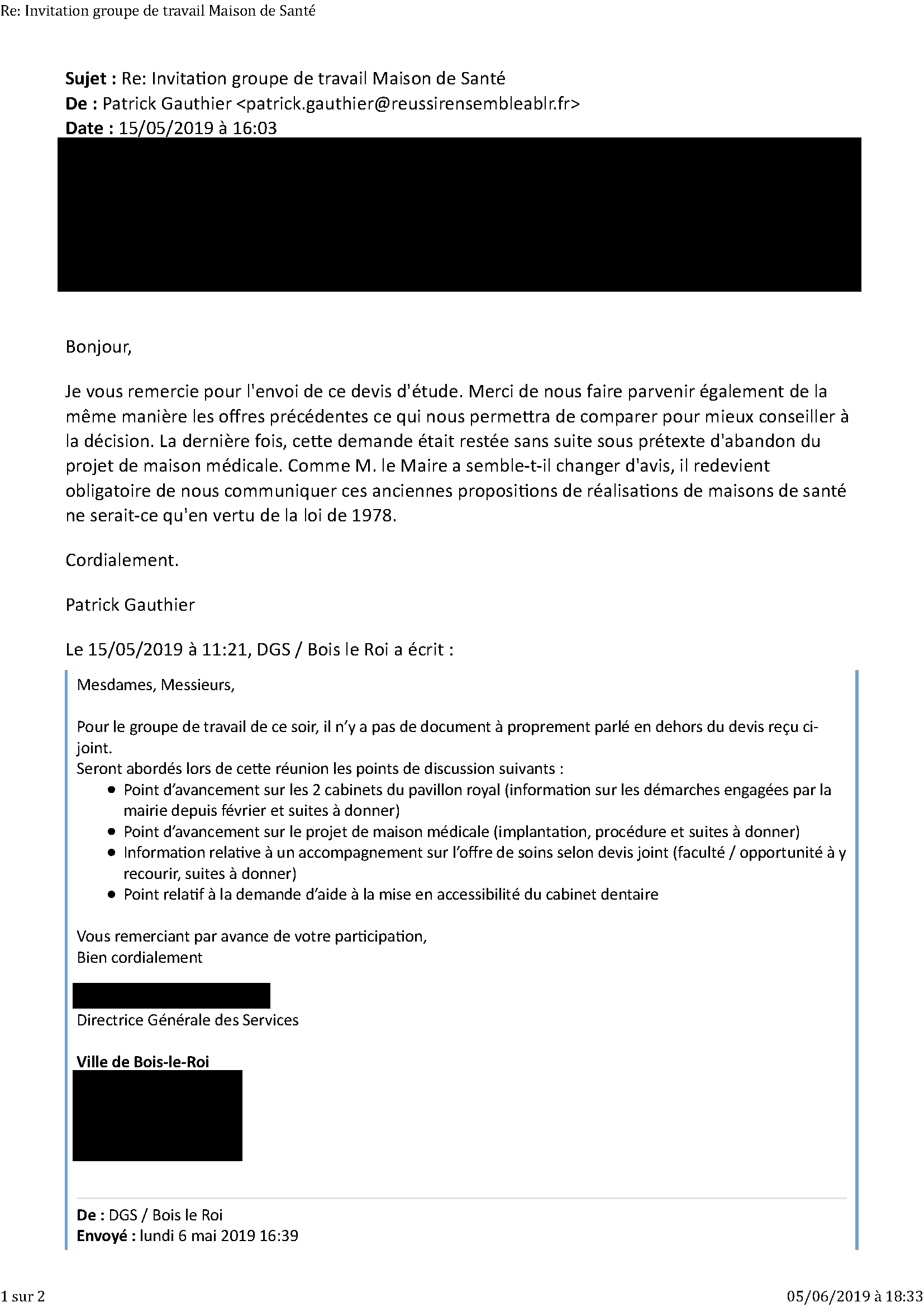 Lors du dernier groupe de travail du 15 mai 2019 sur le projet médical, pour ne pas fournir ces documents, il a été évoqué par M. le Maire que certains de ces documents étaient perdus, par Mme Gire que ces projets médicaux étaient trop axés sur l’immobilier et par Mme La Directrice Générale des Services que ces documents étaient obsolètes (les projets auraient été reçus en octobre 2018 !).