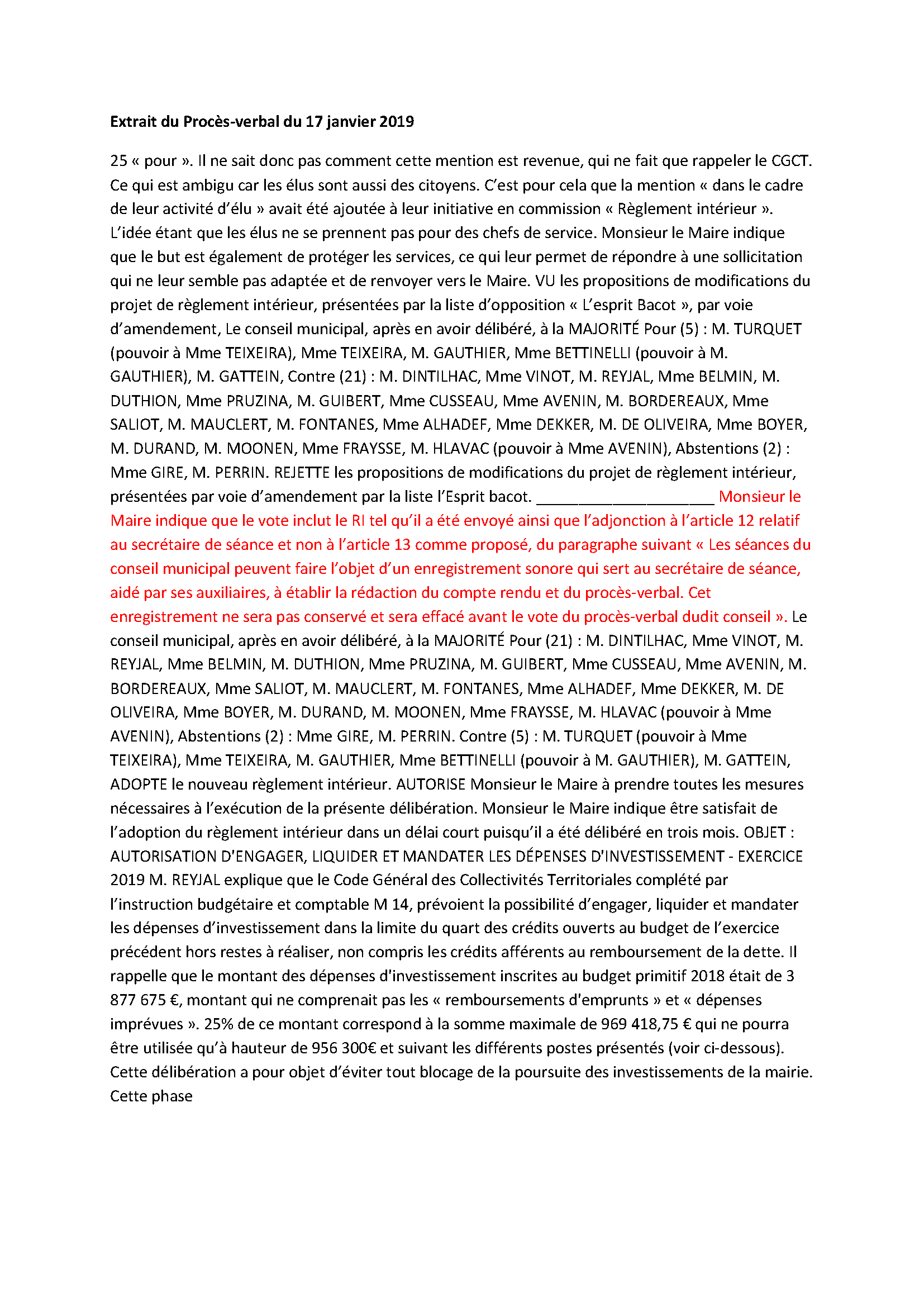 Travailler, proposer dans l’urgence ou l’ignorance est loin d’être optimal. Les enregistrements sonores des conseils municipaux sont détruits volontairement (Preuve n° 6) et les comptes rendus de ces derniers sont tronqués ou transformés. L’histoire de notre commune est écrite par M. le Maire qui décide et fait voter par sa majorité ce qui a existé et ce qui n’aura jamais existé (Preuve n° 1 et n° 2).
